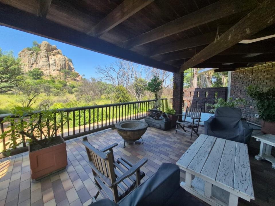 This contemporary home has the wow factor designed to offer style from when you open the front door- it flows the feeling of airiness lots of light space, and uncluttered lines where the beauty of the outside and the inside blend. Breakfast on the patio in the company of birdlife. Exceptionally entrance to the property. A residential dwelling that is spread across two floors. The one ground-floor bedroom has a shower and toilet with a basin. Typically the ground floor includes the perfect kitchen with scullery and pantry. Large dining and lounge while the upper floor is where the other 3 bedrooms are. Private lounge between the 3 bedrooms. Master bedroom with a lovely ensuite and ample cupboards door that opens onto the balcony with jacuzzi and perfect view of the koppie, manicured garden, and pool. Tripple lock-up garages. Good security an alarm system with an intercom. 3Kva solar panels. The property is surrounded by walls and a motorized gate.