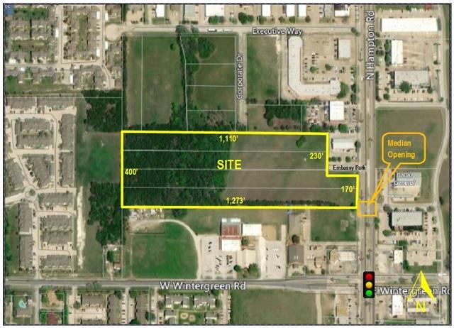 This is a commercial campus site in northern DeSoto. It is comprised of 4 platted but contiguous sites. It has frontage on Hampton Road, Embassy Park, and Corporate Drive. Hampton has about 30,000 cars per day, and a median opening is present to serve the site. It is level with trees in the back, and no creeks or flood. Part is zoned GR, part PD for business uses. Ideal for anything campus related such as storage, charter school, flex, church, etc.. Seller can add another 1.1-acre site on Hampton for an extra $417,000.
